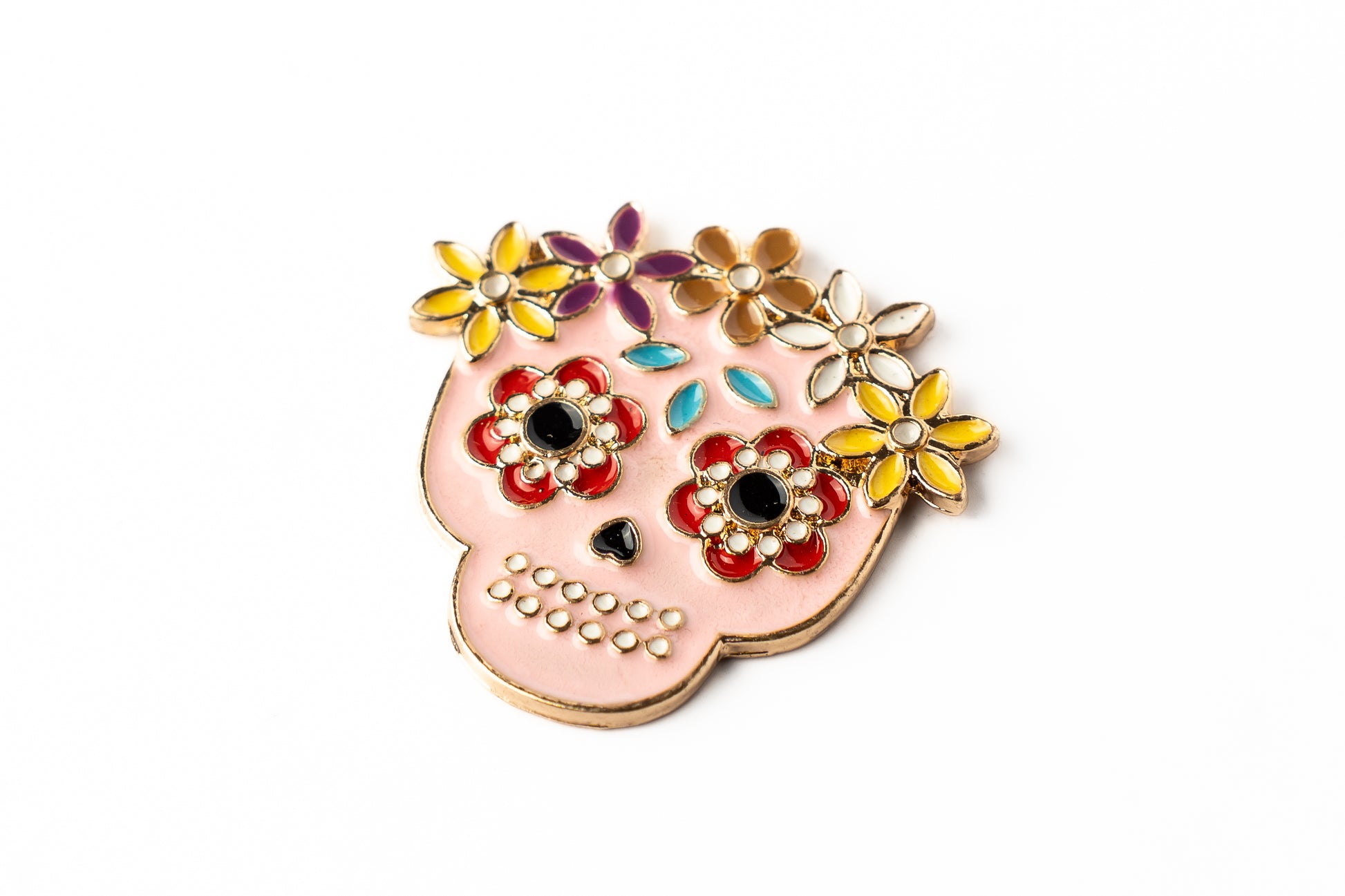 Marcador de bola de golf con diseño de calavera en tono rosa pastel, con detalles florales en colores cálidos como rojo, amarillo y dorado. Su acabado esmaltado y su forma simétrica la hacen ideal para destacar con un toque festivo y femenino. Compatible con clips magnéticos.