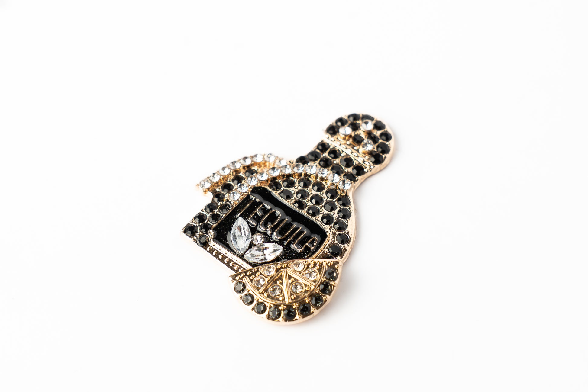 Marcador de bola de golf de diseño negro, con detalles dorados y cristales brillantes, ideal para quienes aman lo elegante con un toque misterioso. La rodaja de limón en dorado y negro remata un look sobrio pero llamativo. Compatible con clips magnéticos.