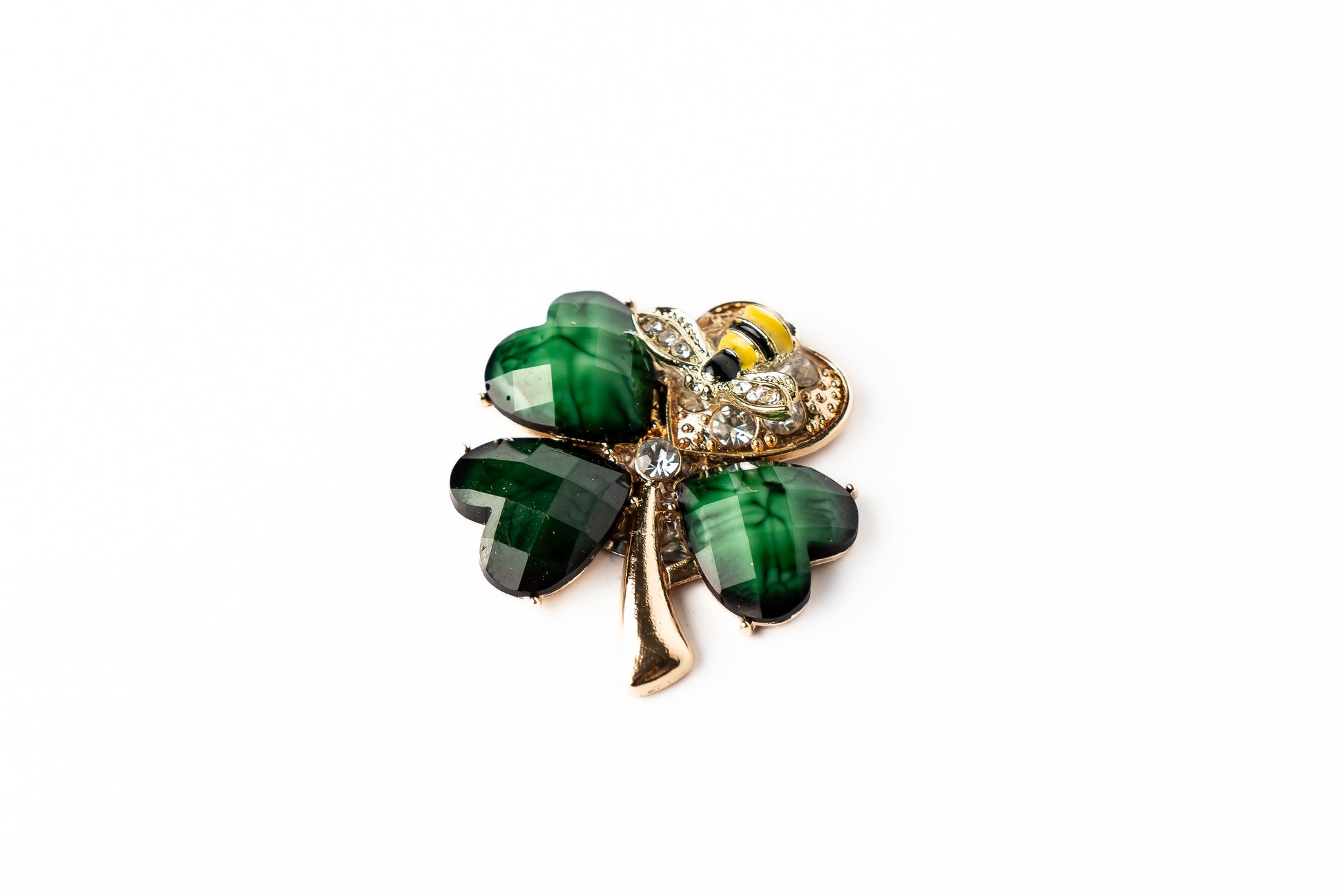 Marcador de bola de golf con diseño de trébol de cuatro hojas, con piedras verdes brillantes en cada hoja y detalles dorados en el tallo. Incluye una pequeña abeja decorativa sobre una de las hojas, añadiendo un toque distintivo y encantador. Los cristales en el cuerpo de la abeja y el tallo del trébol le dan un acabado llamativo. Compatible con clips magnéticos, es ideal para quienes buscan estilo y buena suerte en el campo.