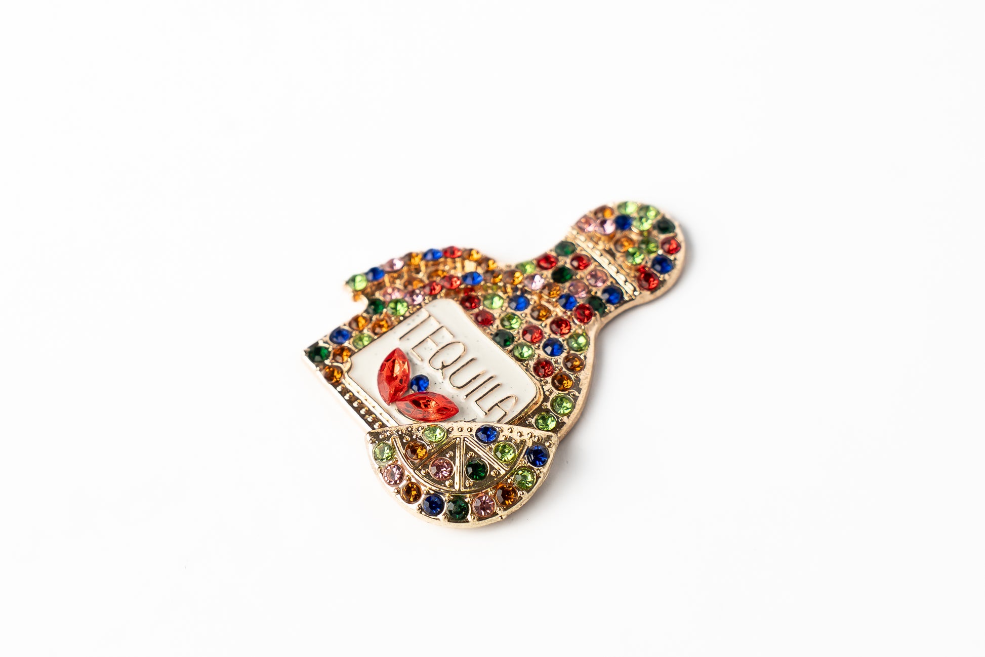 Marcador de bola de golf con diseño de botella completamente cubierto en cristales multicolores que reflejan la luz desde todos los ángulos. El detalle de la rodaja de limón en el juego aporta un toque aún más festivo. Ideal para quienes aman destacar en el campo con originalidad y color. Compatible con clips magnéticos.
