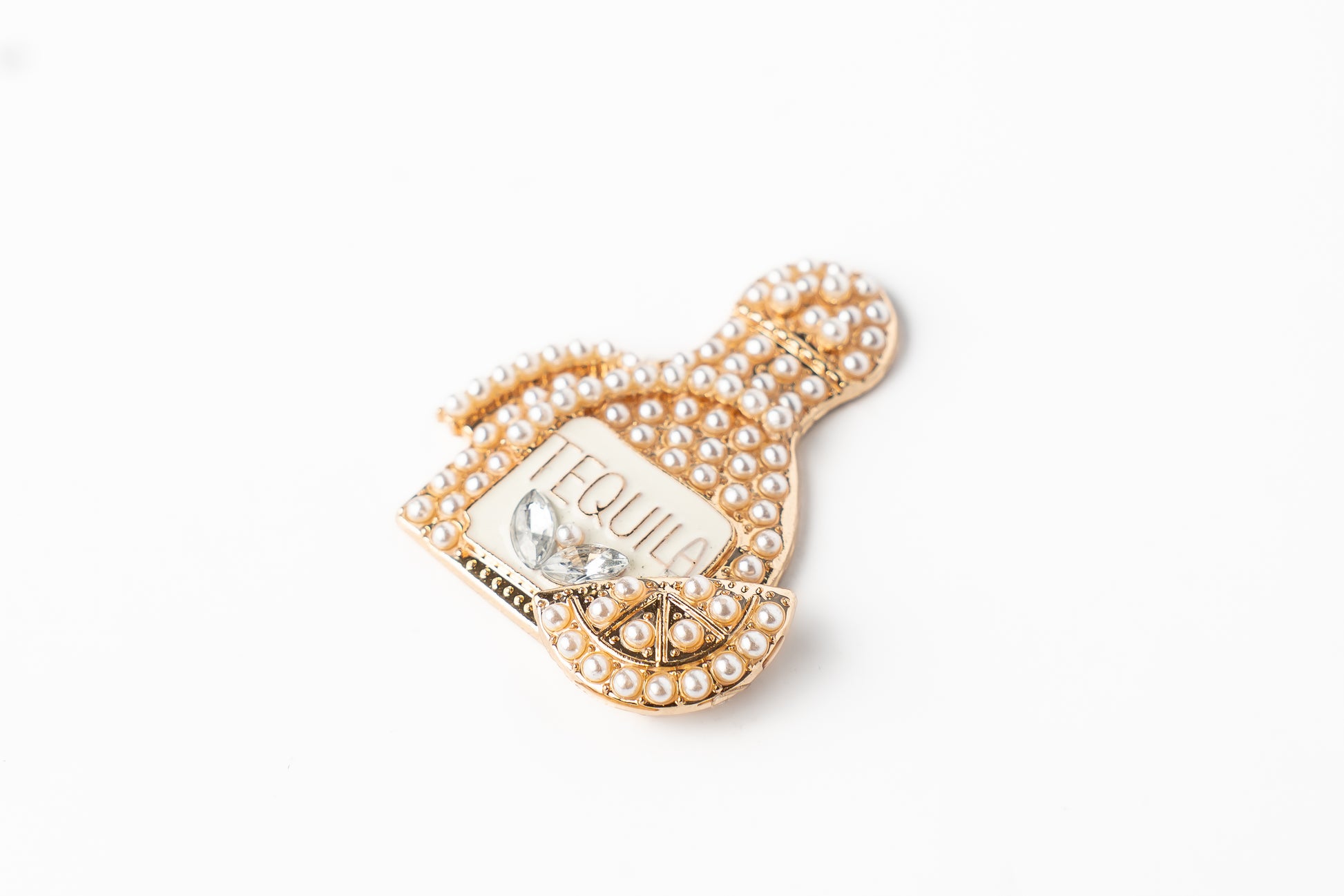 Marcador de bola de golf con diseño de botella decorado completamente con perlas blancas, acentuado con detalles dorados y cristales transparentes. La rodaja de limón también lleva perlas, logrando un estilo uniforme y elegante. Una pieza ideal para quienes buscan sofisticación con un brillo clásico. Compatible con clips magnéticos.