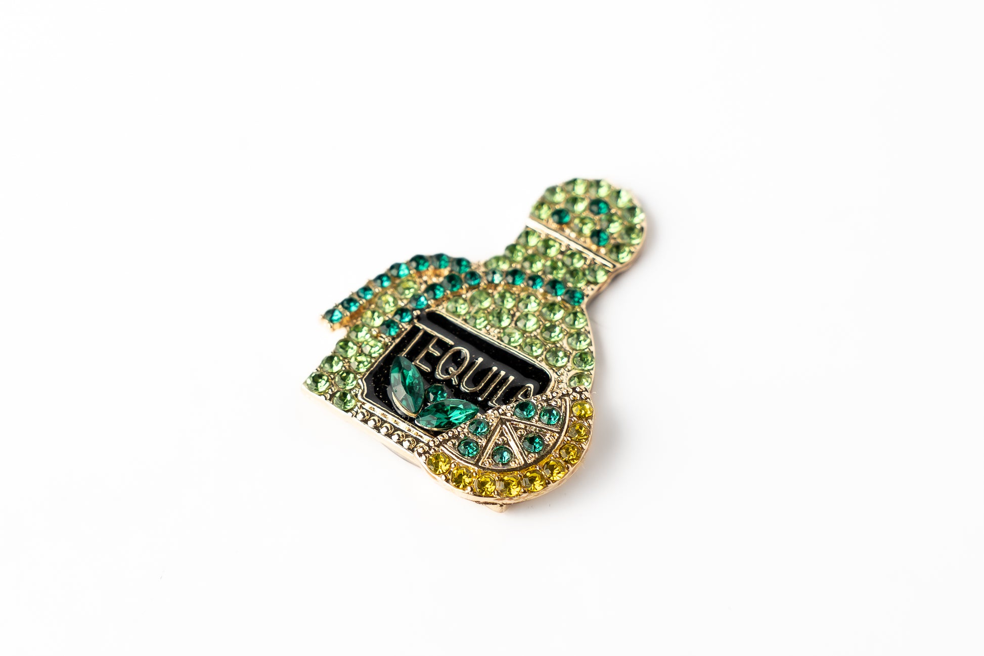 Marcador de bola de golf inspirado en una botella de tequila con decoración en cristales verde lima y esmeralda. El cintillo y la rodaja de limón en tonos verdes y amarillos le dan un aspecto fresco y vibrante, perfecto para quienes buscan un look alegre, natural y lleno de energía. Compatible con clips magnéticos.