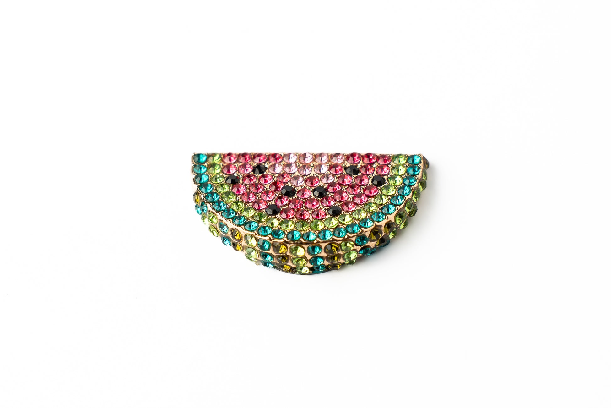 Marcador de bola de golf con diseño de rodaja de arena, decorado con cristales en tonos verde claro y oscuro para la cáscara, rosado claro y oscuro para la pulpa, y cristales negros que simulan las semillas. Su estructura con acabado dorado le da un toque elegante que contrasta con su diseño colorido y fresco. Compatible con clips magnéticos, ideal para quienes desean personalizar su equipo con un accesorio vistoso, original y funcional.