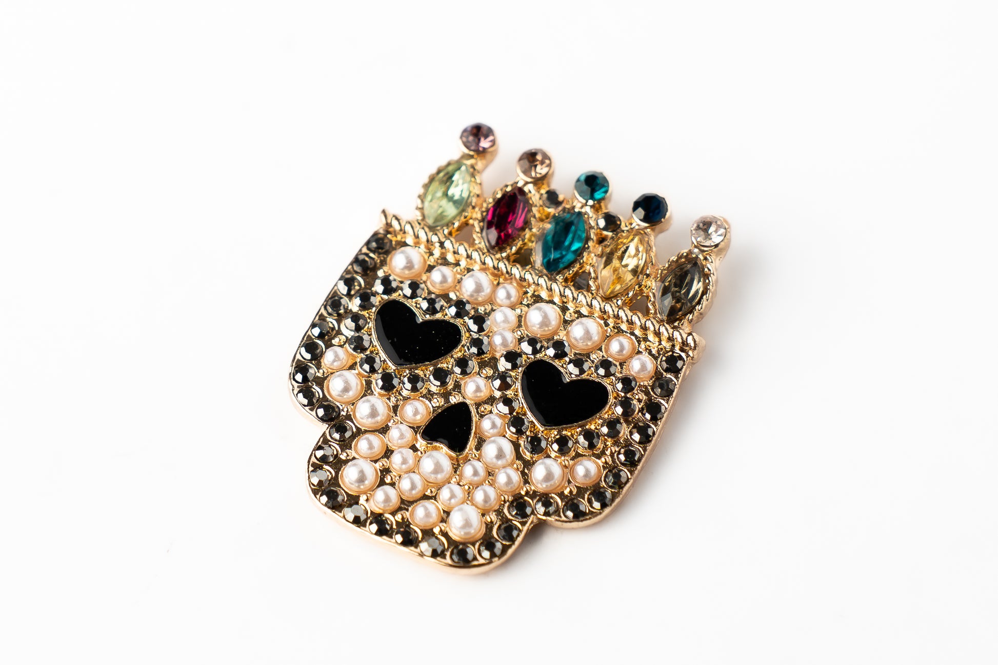 Marcador de bola de golf con forma de calavera, decorado con perlas blancas, cristales negros y una corona de piedras multicolor. Los ojos en forma de corazón y el acabado dorado le dan un estilo atrevido, cómodo y divertido. Una pieza que fusiona brillo, lujo y originalidad. Compatible con clips magnéticos para gorra o visera.